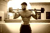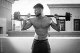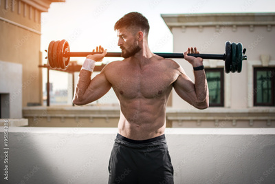 Muscular sexy man with barbell over shoulders working out outdoors.