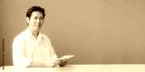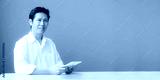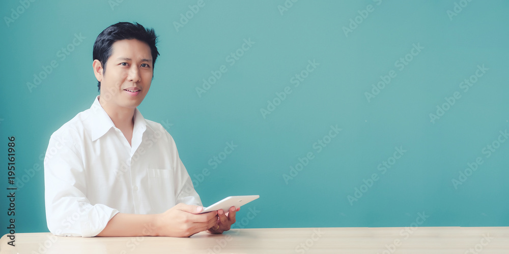 Young asian businessman using tablet with smiling face, positive emotion, at office, casual office life concept