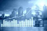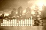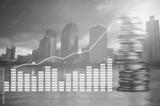 Finance, profit, capital banking and investment concept, Double exporsure stacked of coins and night city with graph
