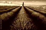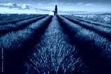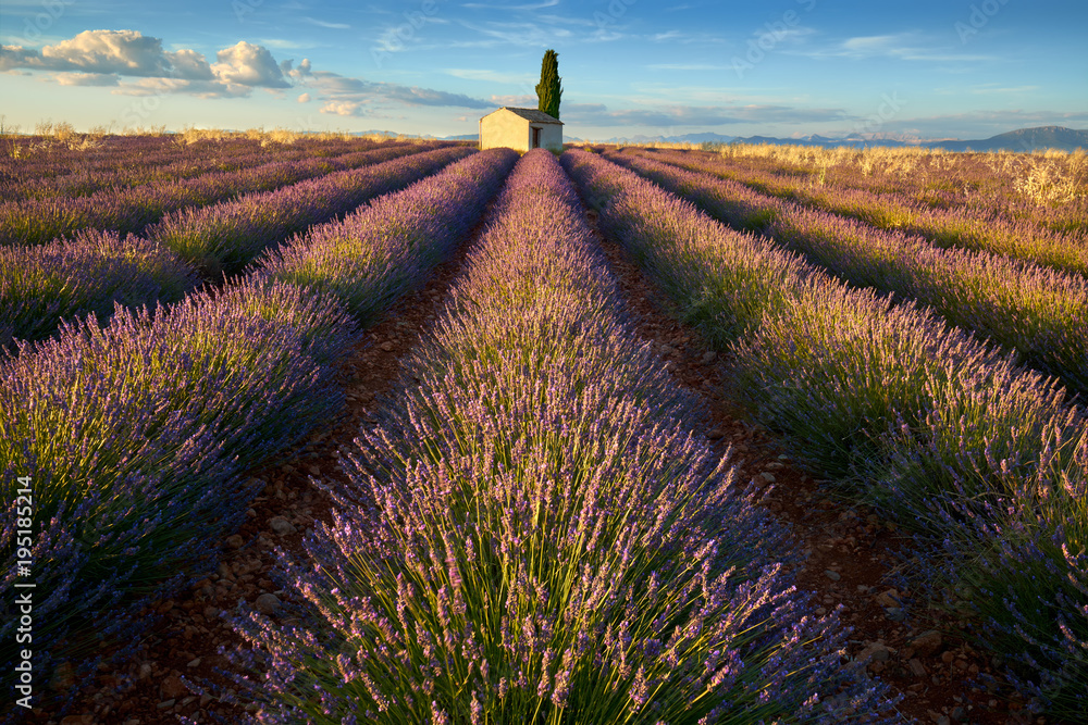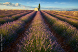 Lavender fields of Valensole with cypress tree and house in Summer at sunset. Alpes de Haute Provence, PACA Region, France