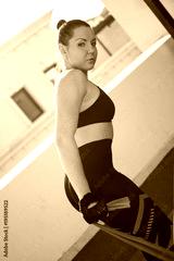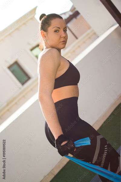 Side view of young sportswoman exercising with elastic resistance fitness band outdoors.