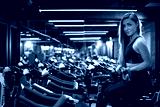 Beautiful fit young sportswoman with dumbbell weights workout on exercise bike at gym.