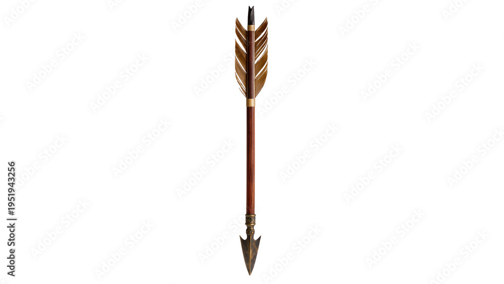Vintage wooden arrow with golden brown feathers and metallic arrowhead, perfectly isolated PNG on transparent background, traditional archery equipment