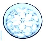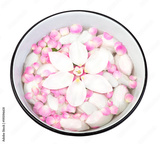 spa procedure, floral arrangement, harmony concept. there are white petals that are floating on the surface of the clean water in basin, they compose a circle and look like flower from top view
