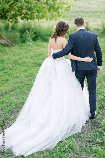 love, marriage, wedding day concept. there is a couple of newly marries woman and man dressed for the ceremony of engagement, they are standing by each other and hugging delicately
