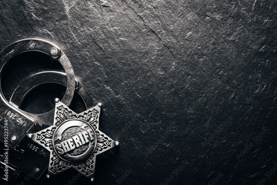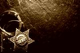 Sheriff star and handcuffs on black slate table closeup. Law concept background