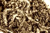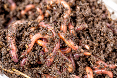 Macro shot of red worms Dendrobena in manure, earthworm live bait for fishing.