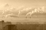 Urban landscape smoked polluted atmosphere from emissions of plants and factories, view of pipes with smoke and residential apartment buildings.