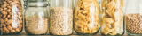 Various uncooked cereals, grains, beans and pasta for healthy cooking in glass jars on wooden table, white background, close-up, wide composition. Clean eating, vegan, balanced dieting food concept