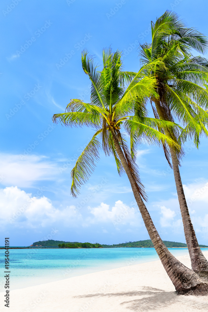 Vertical tropical beach view with leaning palm trees, white sand, turquoise water and clear blue sky on Koh Samui, Thailand. Strong commercial image for travel, summer vacation and resort advertising.