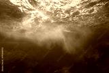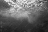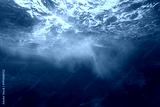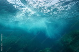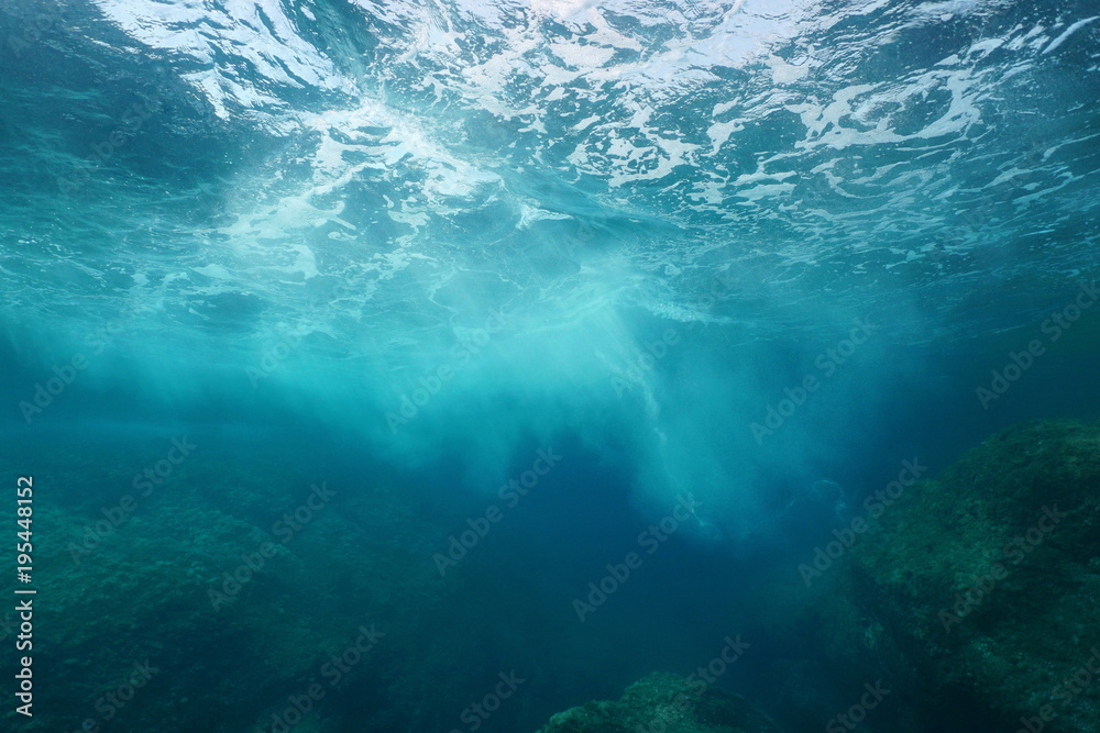 Sea foam formed by wave breaking on rock, seen from underwater, Mediterranean sea, Cote d'Azur, France