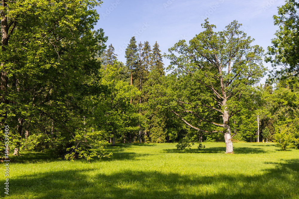 A solitary oak stands in a sunlit grassy meadow at the edge of a dense forest, surrounded by vibrant green foliage and dappled shade conveying peaceful, natural countryside atmosphere