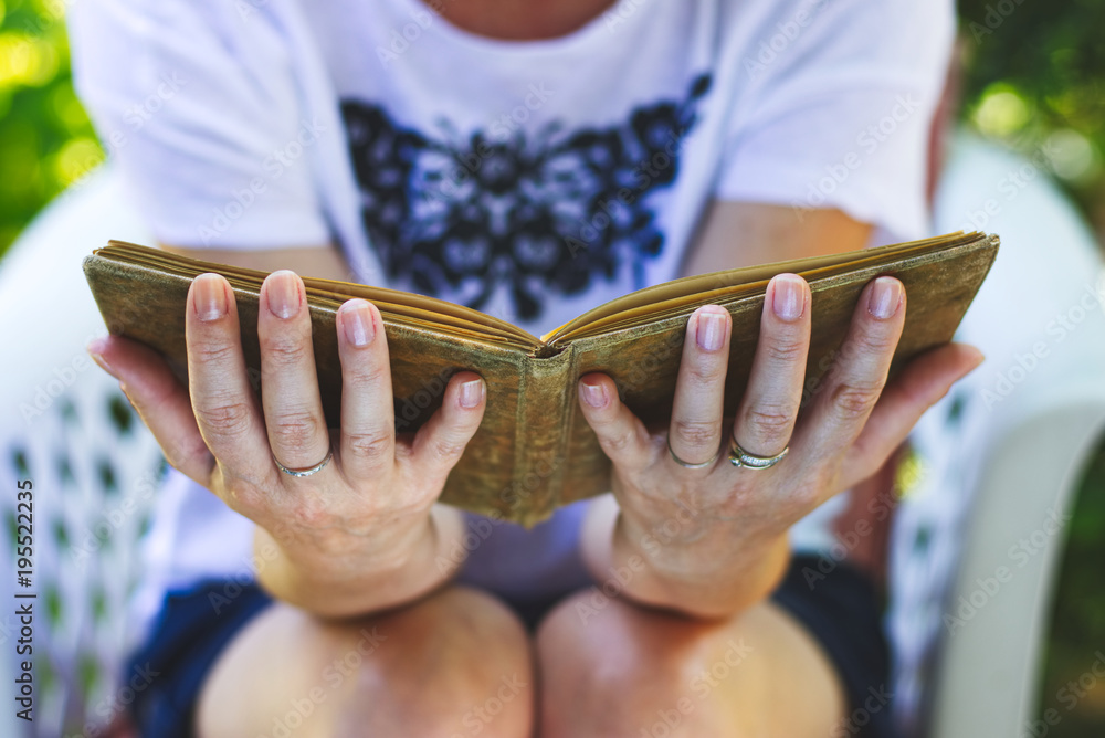 Woman is sitting in chair and reading a old book. Relaxing in the garden with a book in hands.