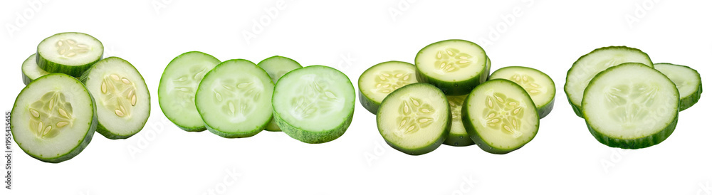 Freshly sliced green cucumber pieces, neatly arranged in various groups.
