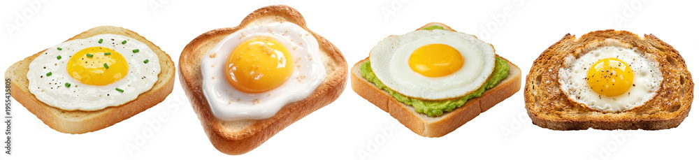 Various appetizing fried egg sandwiches and toasts, a classic breakfast or brunch meal, photographed in detail.