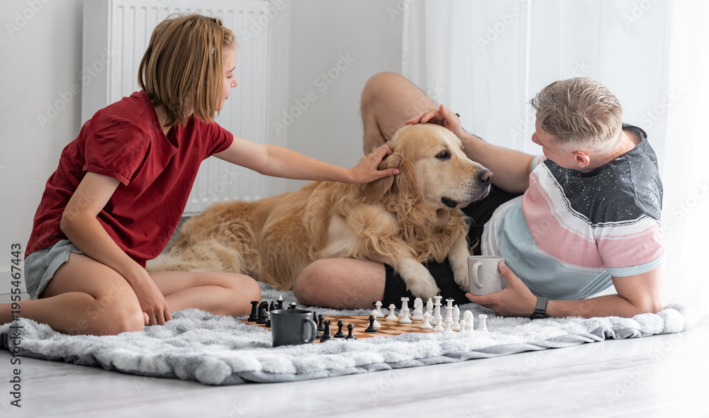 Happy Little Girl And Father Play Chess While Petting An Adorable Dog With Happy Family Spending Time Together