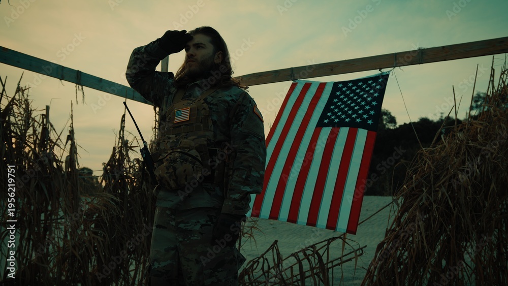 American flag on Memorial Day and soldier honoring fallen soldiers in desert