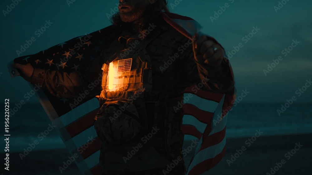 Memorial Day Of An American Soldier At Night With The Flag Behind Him