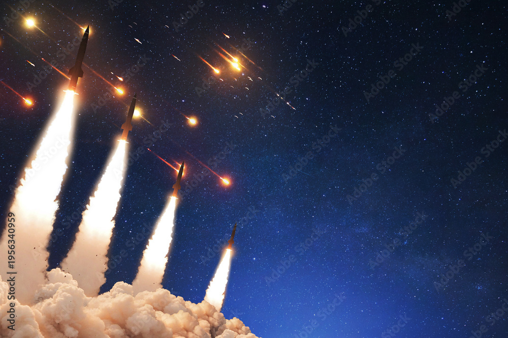dramatic night scene depicting a strategic ballistic missile barrage launch under a clear starry sky, with multiple rockets ascending simultaneously, tracer trails filling the sky. War