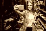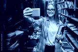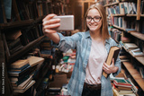 A cute picture of a blonde girl taking selfie. She is looking to the phone and smiling. This girls is in a big public library.