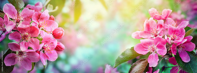 Cherry blossom, sakura flowers. Abstract blurred wide background of spring blossoms tree, selective focus.