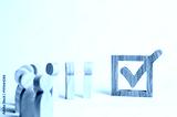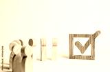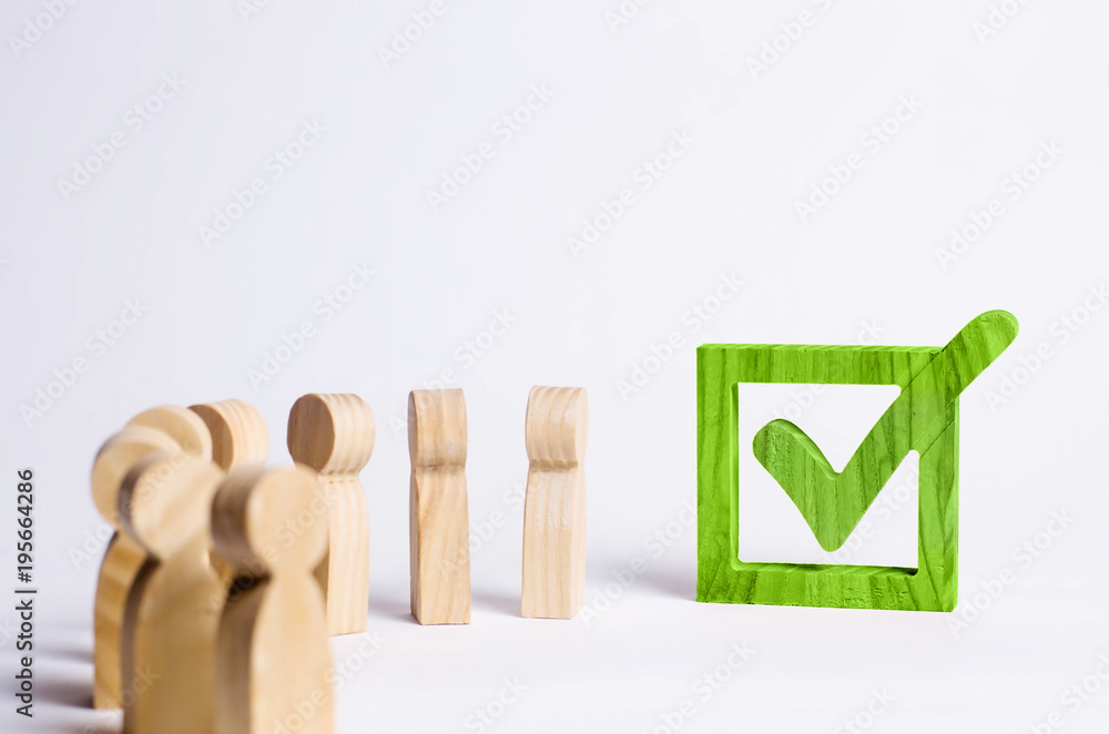 wooden human figures stand together next to a tick in the box. The concept of elections and social technologies. Volunteers, parties, candidates, constituency electorates. Selective focus