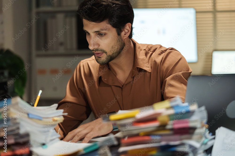 Paperwork and document work show a clerk in accounting and law report research, searching files on a laptop in an office shaped by bureaucracy.