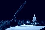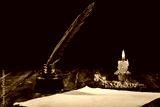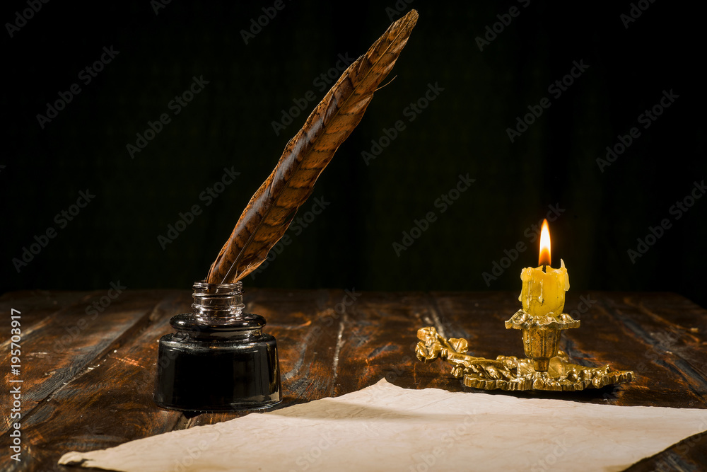 Education and writing concept, pen in ink bottle and candle holder with candle on wooden table.