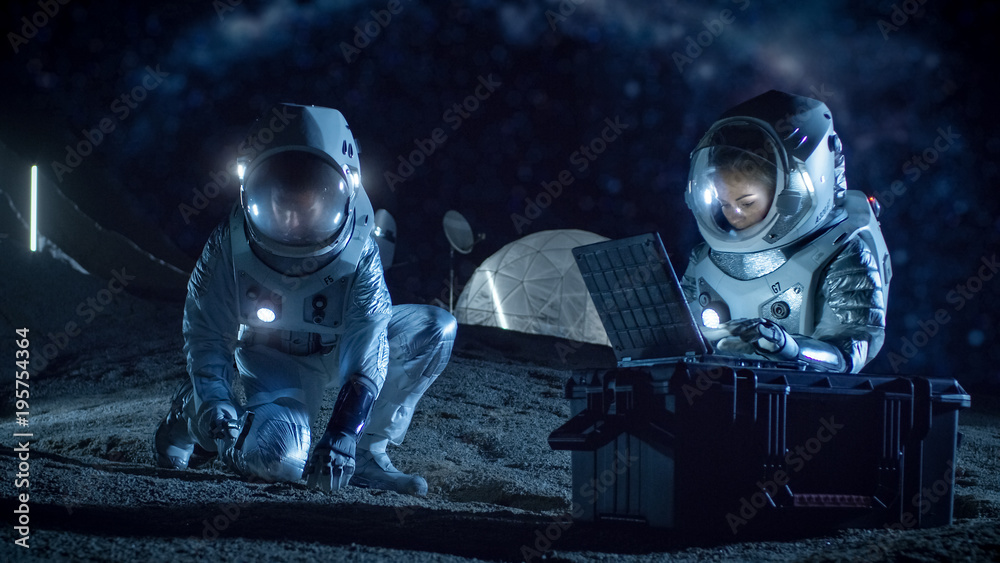 Two Astronauts Collect Rock and Soil Samples on the Alien Planet. Space Travel and Exploration, Finding Habitable Planet, Colonization Concept.