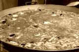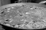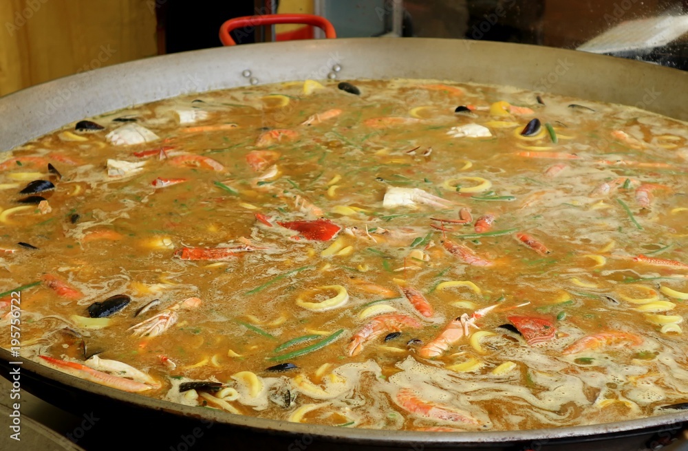 Cooking the paella in a large pan. Put fresh on the stove, with the water that has yet to be absorbed by the rice