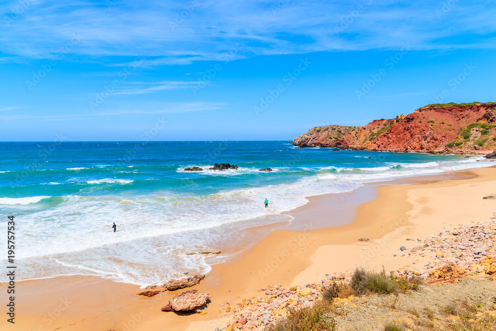 Surfers on Amado beach with big sea waves, Algarve, Portugal
