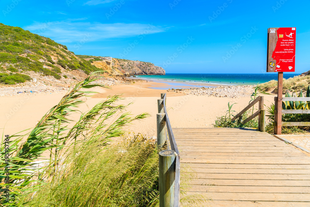 ZAVIAL BEACH, PORTUGAL - MAY 15, 2015: Wooden walkway to beach on sunny summer day. Algarve region is very popular holiday destination in southern Europe.