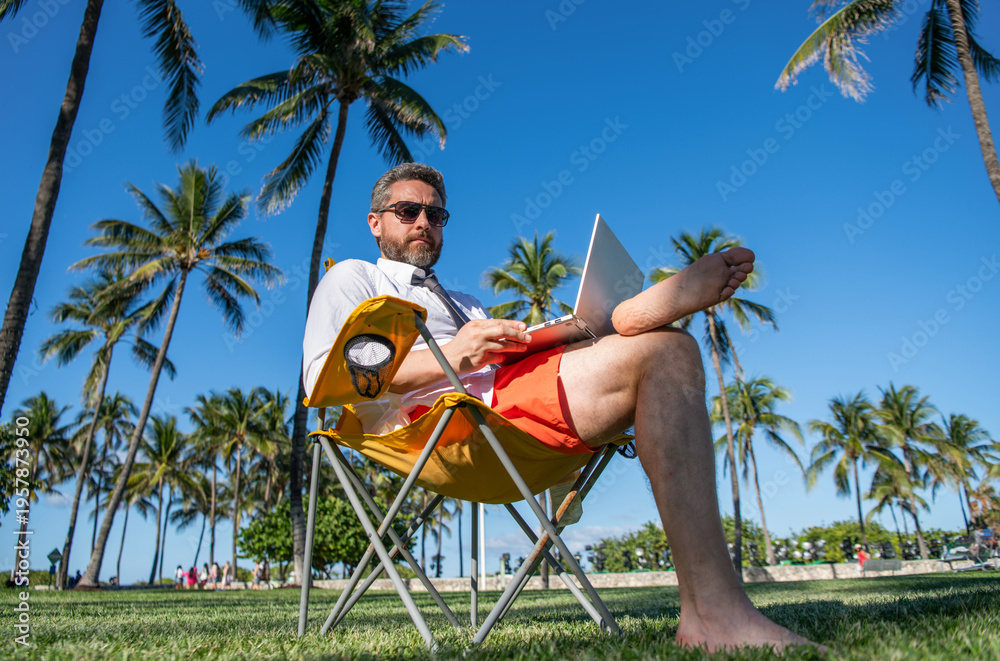 Man freelance worker online at beach. Businessman on summer. Online freelance work. Businessman office worker with laptop. Business man using laptop at palm tree. Business trip. Laptop on vacation