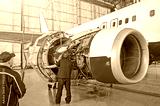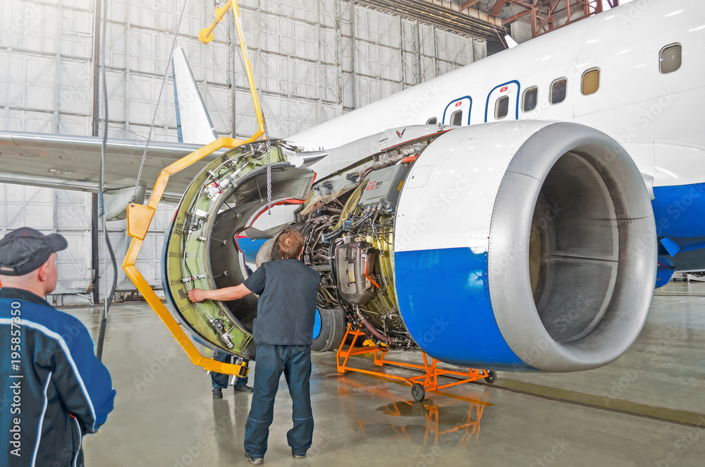 Assembling, replacing engine parts of the aircraft after repair. Specialist mechanic controls the crane when assembling an engine on the wing of an airplane. Concept maintenance of aircraft.