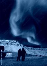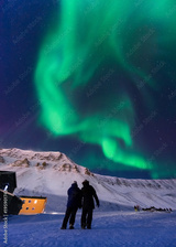The polar arctic Northern lights aurora borealis sky star in Norway Svalbard in Longyearbyen city man people mountains