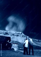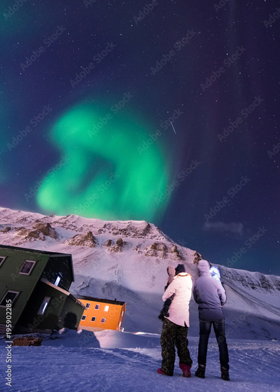 The polar arctic Northern lights aurora borealis sky star in Norway Svalbard in Longyearbyen city man people mountains