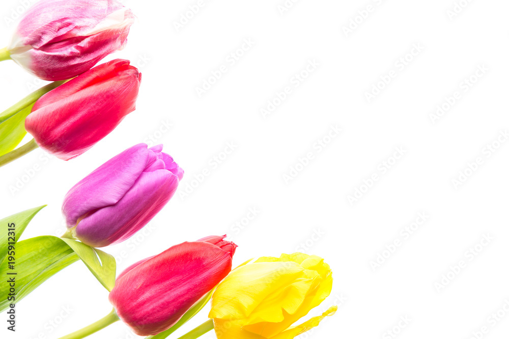 Colorful tulips flowers isolated on white background with free space. Mothersday or spring concept.