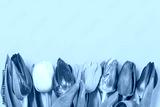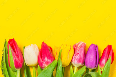 Colorful tulips flowers in a row on yellow background with free space. Mothersday or spring concept.