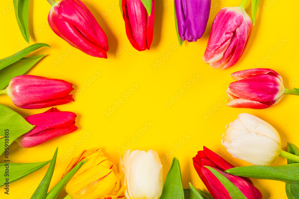 Colorful tulips flowers on yellow background with free space. Mothersday or spring concept.
