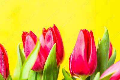 Red colorful tulips flowers in a row on yellow background with free space. Mothersday or spring concept.