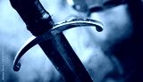 Medieval knight with sword in armor as style Game of Thrones in battle or tournament black and white old photo