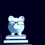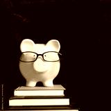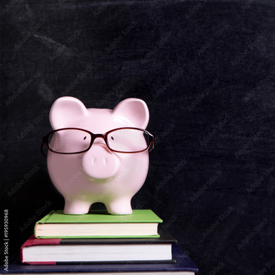 Piggy bank or piggybank wearing glasses standing on a stack of school book in front of a classroom blackboard college fees saving fund photo square format