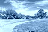 Exterior view of typical apartment near public park in Irving, Texas, USA. Concrete trail for walking, jogging, biking.