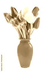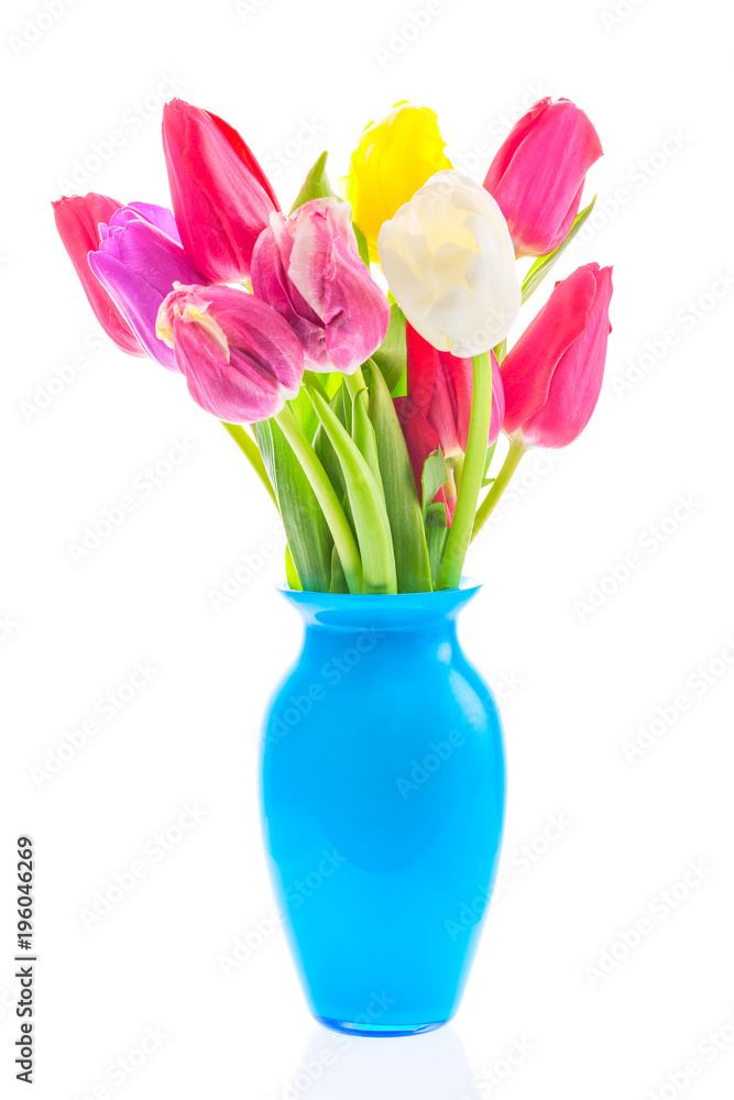 Colorful spring tulip flowers in nice blue vase isolated n white background. Mothersday or spring concept