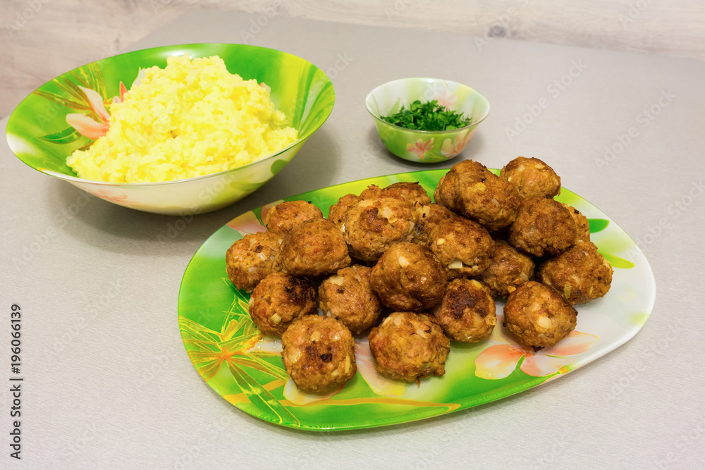 Fried meatballs with mashed potatoes and fresh herbs on a table
