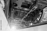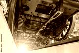 View of the locomotive from underneath the wheels on the between the rails, view from the repair pit.
