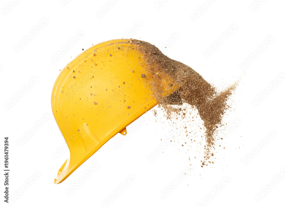 Construction supply equipment Sand fall into safety hard yellow hat as accident. Safety Hat protect supply sand from accident falling hit head. White background isolated