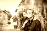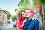 Young woman kissing a man on cheek. Fall in love romantic married couple in bright clothes on the street with blooming trees. Family happiness concept. Soft selective focus. Copy space.