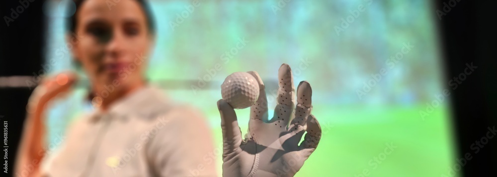A golfer prepares to swing, holding a golf ball in an indoor training facility