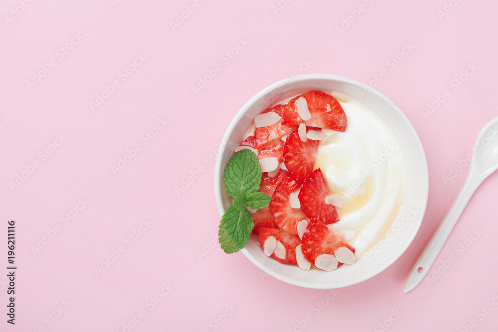 Morning breakfast bowl with greek yogurt, strawberry and honey on a pink table. Top view.
